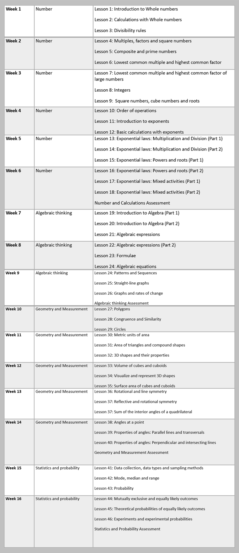 The Skills Enhancement Program is based on those foundational elements essential for success in Stage 7 Mathematics. It focuses on strengthening understanding as well as the correct application of concepts covered in the areas of number, geometry and measure, statistics and probability. Through targeted lessons and personalized support, students will develop the required foundational skills in order to excel in the more advanced academic challenges of Stage 7 Mathematics and beyond.
